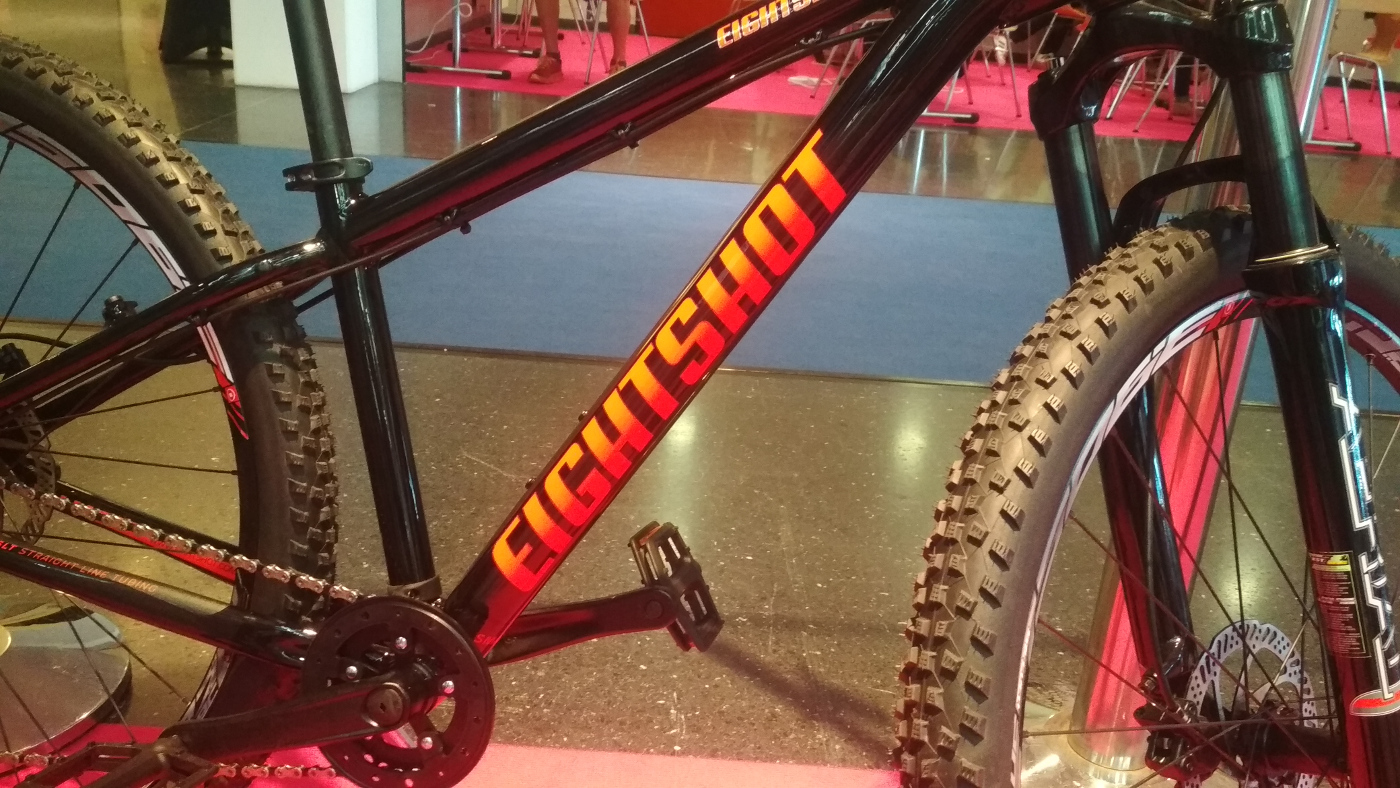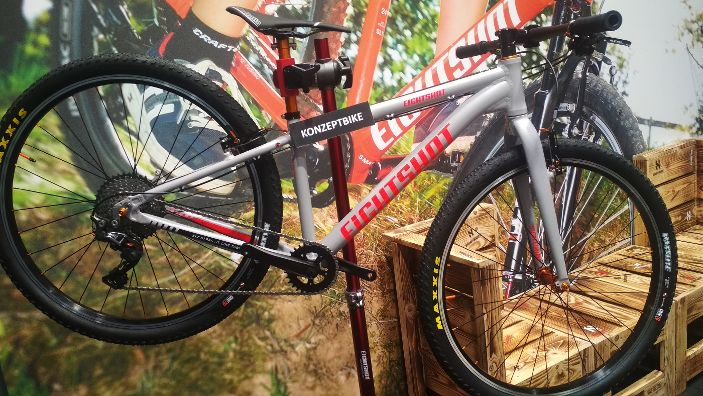 Und da tat es dann keine neue, fetztige Lackierung mehr - und auch kein groß geschriebener, cooler Modellname bei gleichzeitig klein irgendwo verstecktem Markennamen, sondern ein Paukenschlag musste her. Und der heißt nun Eightshot - Eine neue, eigenständige Marke - mit dem Jahrzehnten Know-How der Marke PUKY, aber ohne deren Ballast - auch im wörtlichen Sinne: Denn während PUKY-Räder kaum als Leichtgewichte in Erscheinung treten, hat man sich hier bei Eightshot ins Zeug gelegt - dabei aber PUKY-typisch die relevanten Sicherheitsnormen im Auge behalten. Unterstrichen wurde das Gewichtsthema auf dem Messestand durch ein 27,5 Zoll Leichtbau-Showbike, dass mit edelsten Komponenten von Tune, KCNC, Maxxis und der XTR Gruppe von Shimano auf 7,9kg getrimmt wurde: